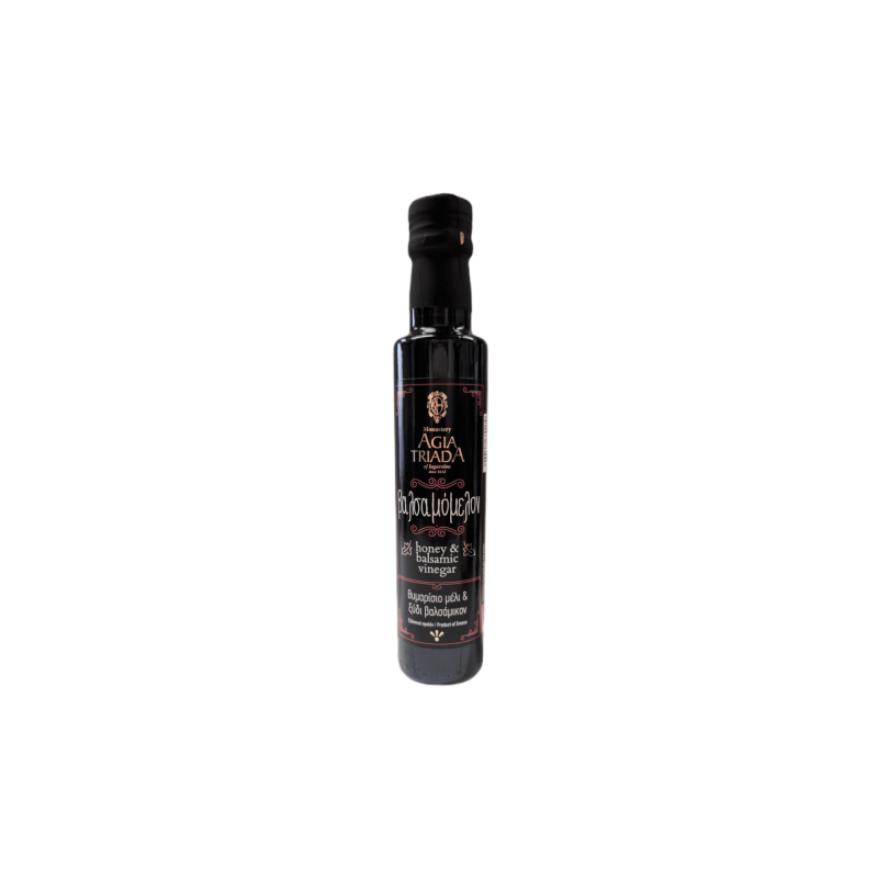 Le vinaigre balsamique du monastère d`AGIA TRIADA de Jagarolon est élaboré sur des moûts de raisin sélectionnés et suivant la recette traditionnelle Aceto Balsamico Tradizionale di Modena. Un long séjour en barriques de chêne lui confère un arôme unique, une texture inimitable. Produit uniquement à partir de raisins et selon des méthodes ancestrales, ce vinaigre de grande classe fait l`objet de contrôles scrupuleux tout au long de sa fabrication. Enrichi par la douceur du miel de thym pour un produit d`épicerie grec unique !